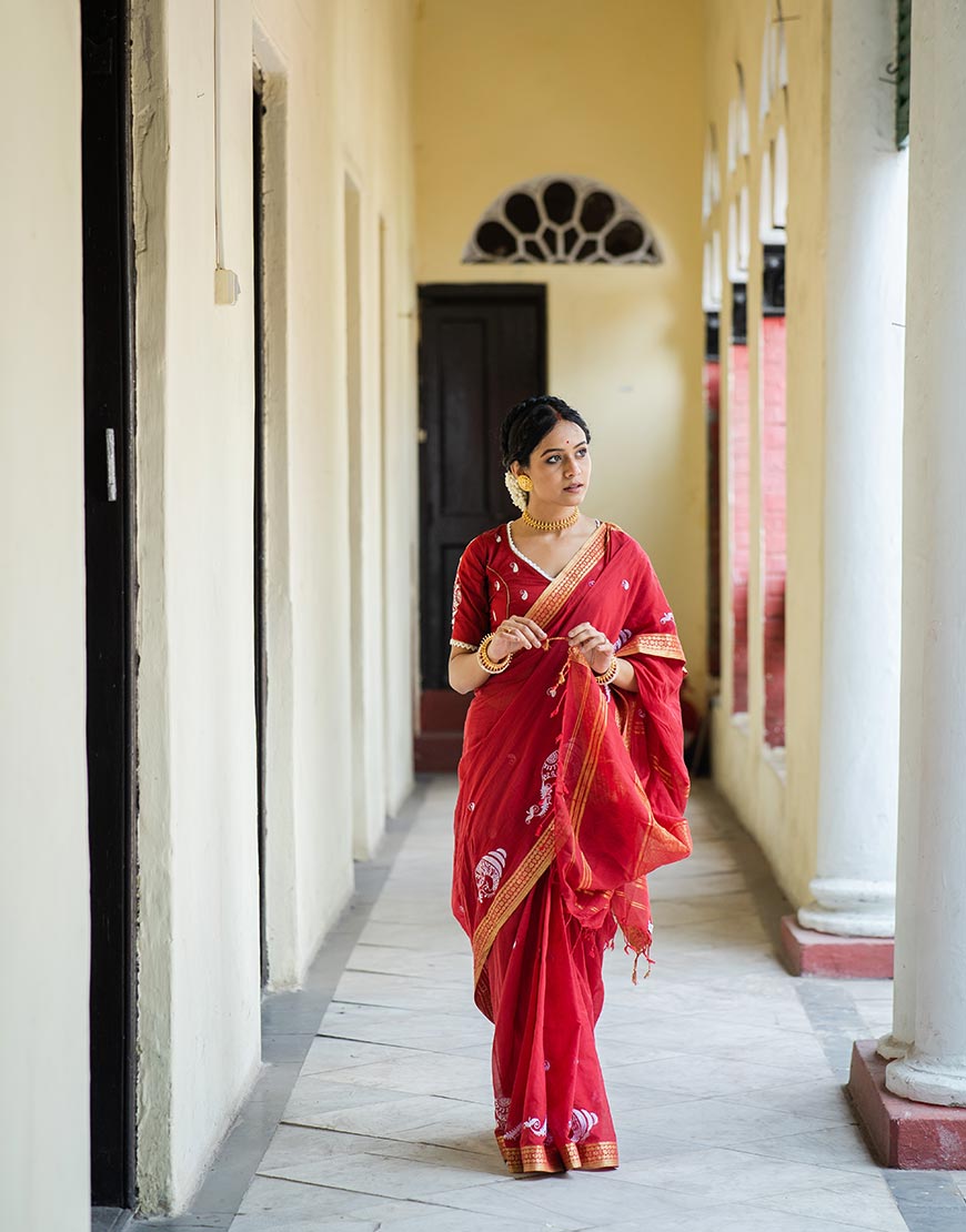 We chose to merge two tradition of Bengal together and present to you, our collection ‘Alpona’. The Hand-woven phulia cotton with handloom jacquard border and the finest embroidery work is just looks like a traditional alpona our ancestors used to paint on floor and wall of houses.