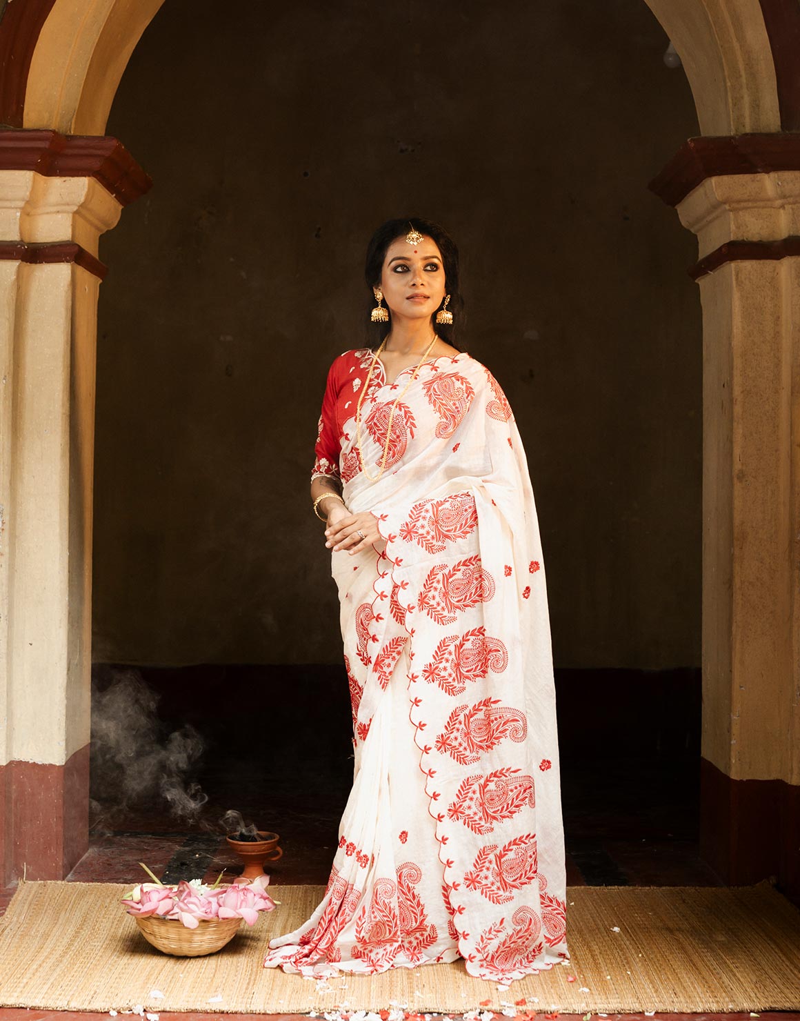 Introducing our exquisite Bijaya Dashami Saree. embodying thevessence of Bangaliana! This stunning laal-shada saree features intricate aam kolka embroidery and a beautifully designed Bijaya theme blouse. Perfect for dhunuchi nach and sindur khela on Mondop, this limited edition, handcrafted saree is specially designed to make your Bijaya Dashami celbration unforgettable. Embrace tradition, elegance and joy with our exclusive collection.