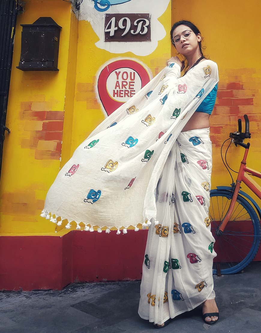 Here we are retouching the nostalgia of the cradles and dialer of the past with particulate embroidery work on hand-woven cotton. The colorful dialers are all around six meters of white saree, not only touching the nostalgia and emotions but also making a well fashioned iconic statement of one’s presence.