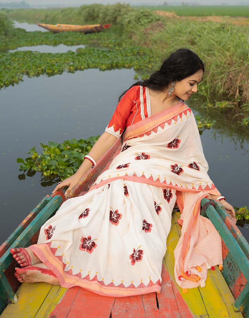 In order to achieve that, we trusted off white pure hand woven mercerized cotton to add the perfect contrast for artistic machine embroidery work with different shades of red to bloom red joba with thread and cloths on all over the six meters in the most fashionable way.
