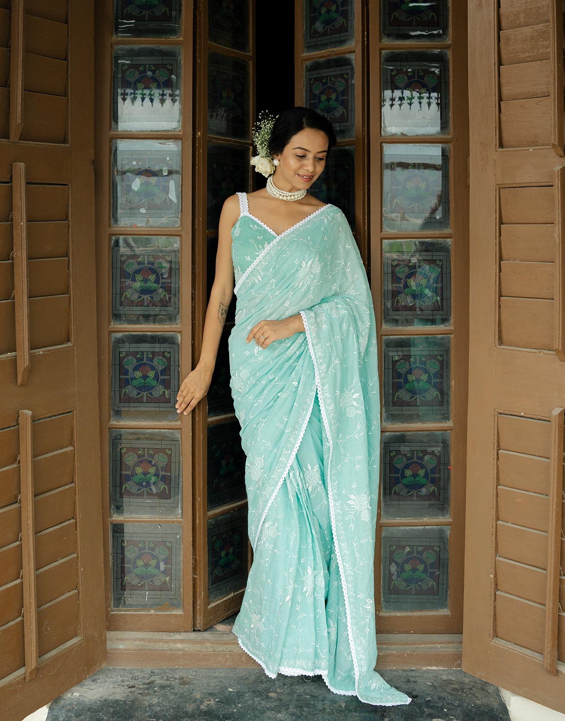 Soft, soothing, and serene, the mint green hue evokes the calming essence of nature. Like a gentle breeze on a summer day, this color envelops you in tranquility, making you feel fresh and revitalized. Intricate white floral embroidery adorns the saree, reminiscent of delicate flower petals swaying in the wind. Each stitch is a testment to the artisan’s skill, weaving a tale of devotion and beauty. Exquisite lace edges add a touch of whimsy and romance, like the tender touch of a loved one. The intricate patterns dance accross the fabric, casting a spell of enchantment.