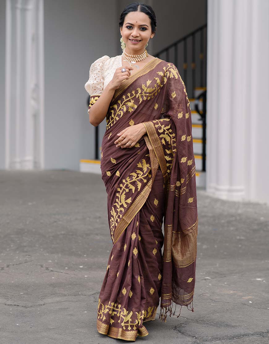 Inspired after ‘jamdani korat’ art, we choose embroidery on six meters brown colored ‘handwoven phulia’ cotton with golden handloom jacquard border similar to ups and downs of the life and the golden colors to signify values of friendship that stick together and help us to overcome that. With it the off white colored ‘cotton hakoba’ blouse with same embroidery enhance the vibes and taste of fashion.
