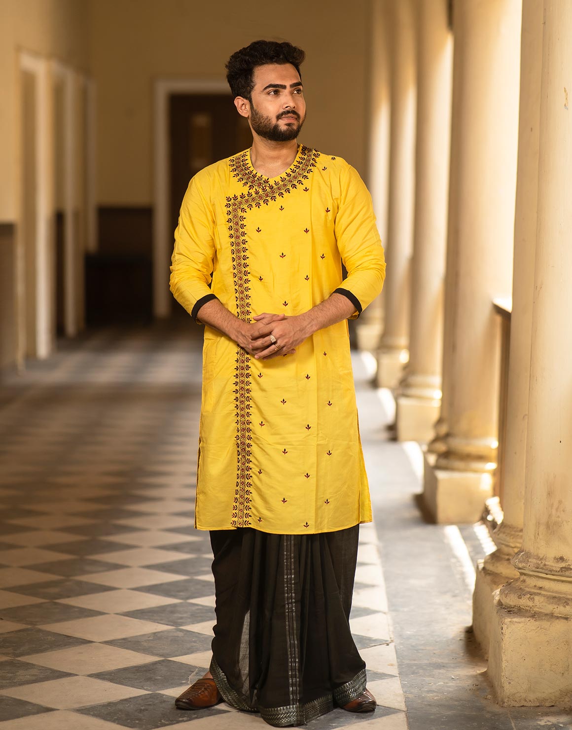 Model is wearing M size Sananda Punjabi & Sananda Dhuti.