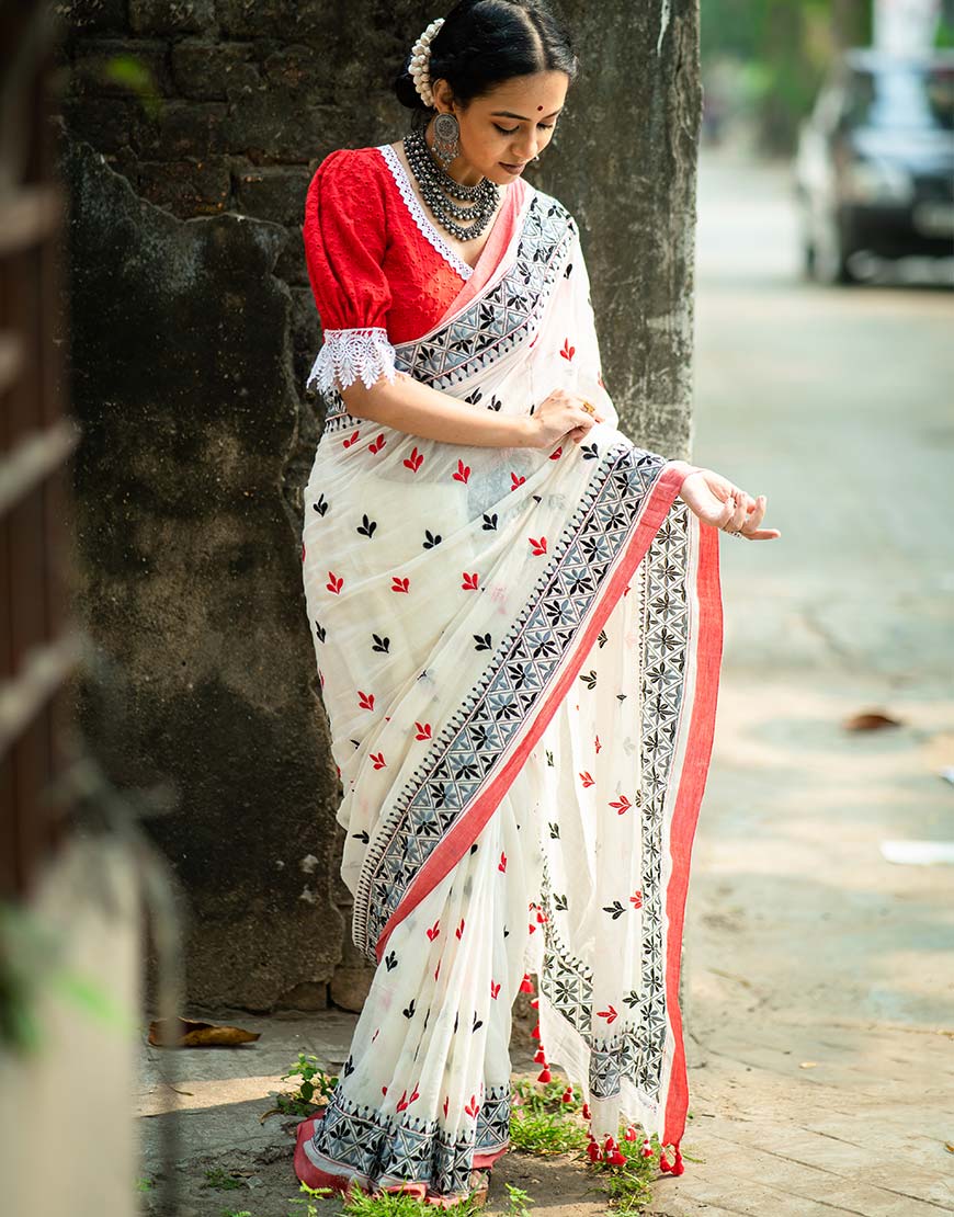 As it told, ‘today is the beginning of the rest of your life’, and to celebrate and embrace the same irrespective of occasion, we offer six meters of the best quality off white color hand-woven cotton with cheerful embroidery works on it.