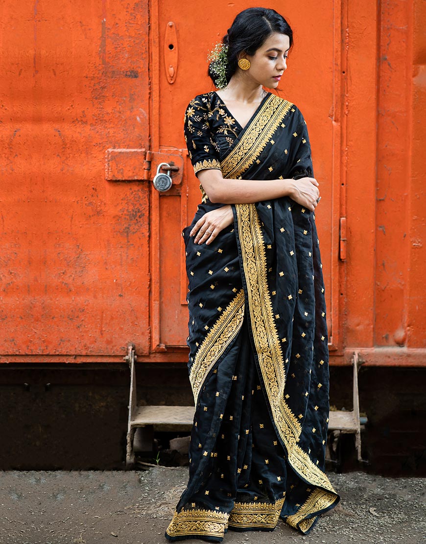 UTTORON” is to advance towards the goal in an honest way. We use silk Organza with machine embroidery work technique, the design symbolize the dual between our moral and immoral sides, and the randomness is to symbolize the blessings, supports, wishes, forgiveness and all the humane and celestial virtues that help us to advance one further step to our ultimate divine goal. Apart from the trendy style and positive vibes, it can be a perfect traditional event wear set up a positive tune in a trendy and classy way.