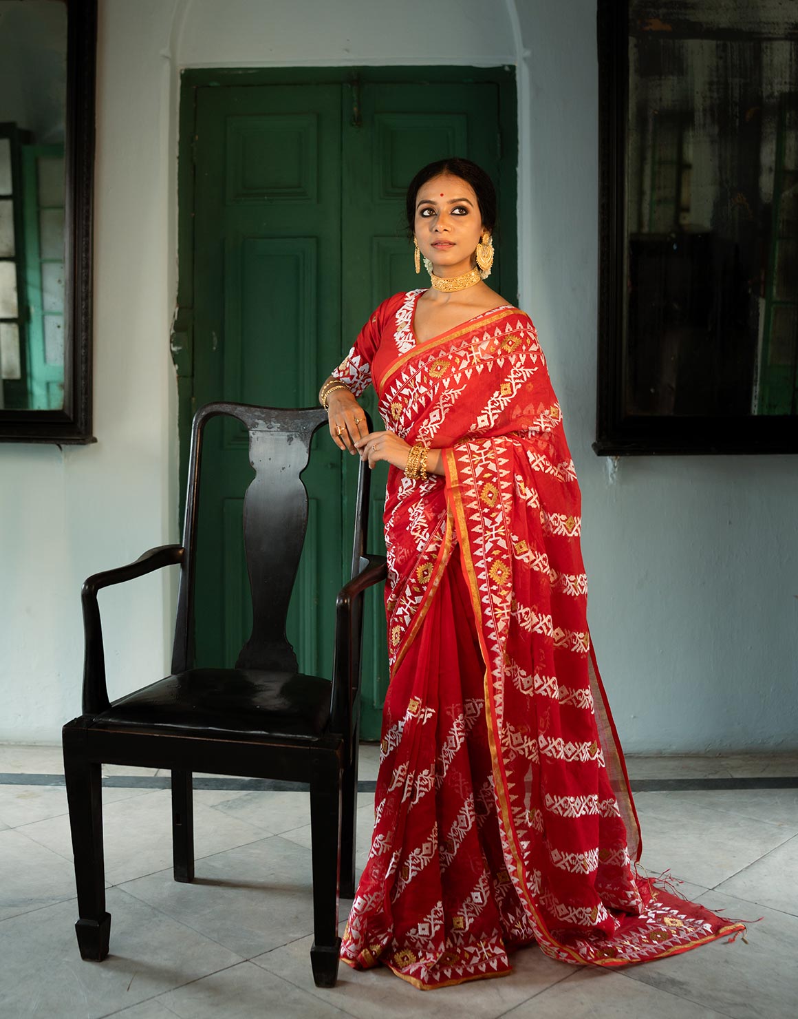 Adorned with intricate embroidery all over, this stunning saree is perfect for Pandal hopping with friends and family also for barir Anjali with loved ones. The vibrant vermillion red hue embodies the true spirit of Durga Puja, shining bright both day and night. This handwoeven silk by cotton saree is entirely embroidered with white thread and golden zari,inspired by traditional Jamdani motif embroidery. Elevate ur Ashtami festives with this breathtaking ensemble, meticulously crafted to capture the essence of the occasion.