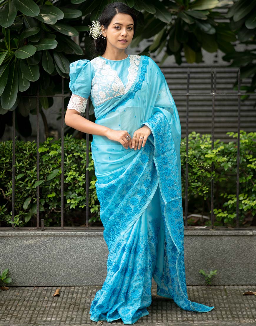 Jonakee therefore select embroidery on 5.50 meters of sky blue Silk Organza cloths to express the same. With the inner beauty and strength of the feminine sides, it also paints the right flushes of growth and hope.