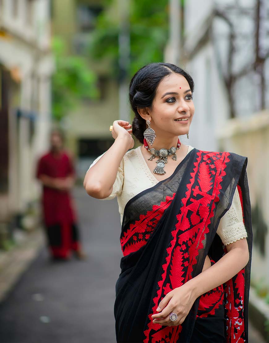 The black and red combination of the saree and the embroidered work is quite rocking and bold at the same time the jamdani work details adding the perfect contrast of calmness and ‘no-biggie’ vibe.