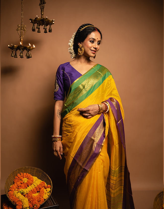 • Fabric: Handwoven art silk with zari check with handloom jacquard ganga jamuna border