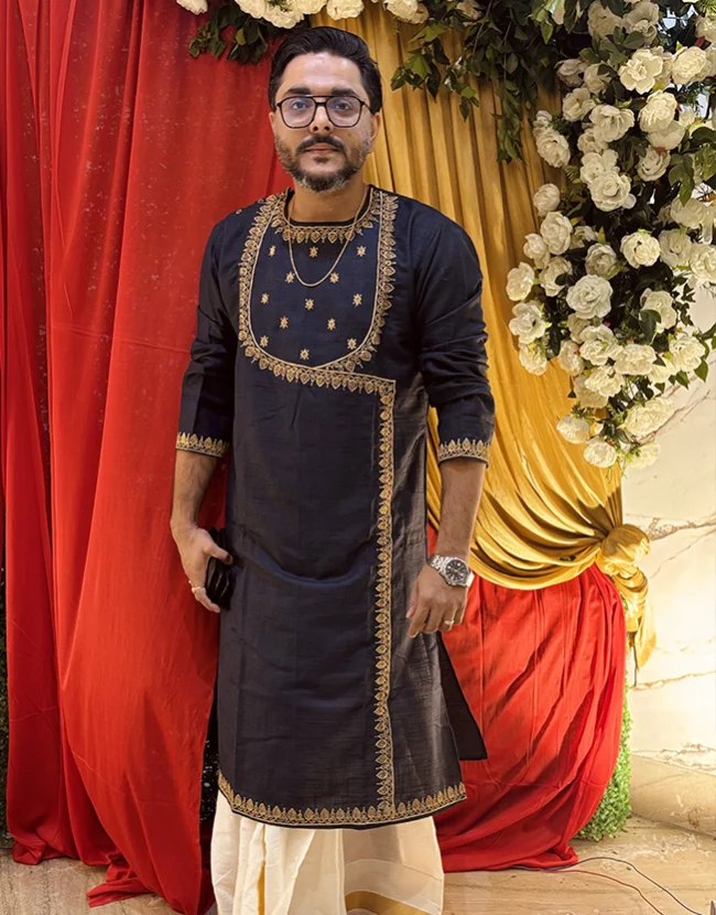 Model is wearing M size Rajon Punjabi, dhuti not for sale.