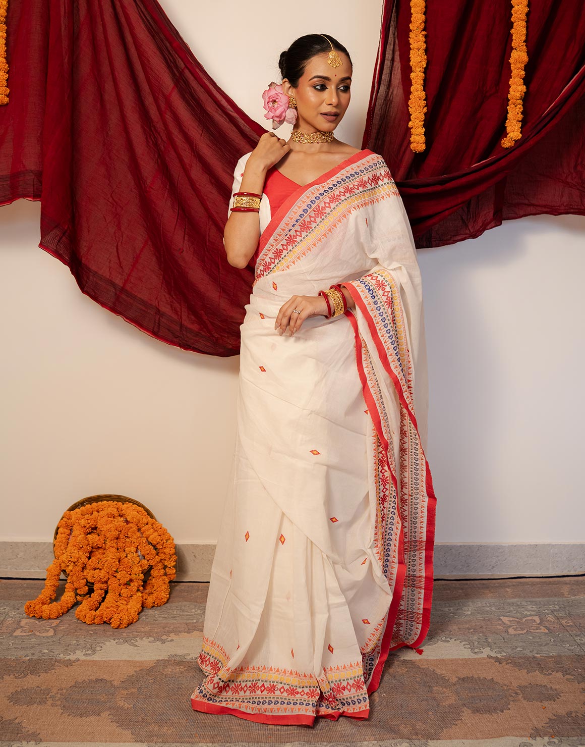 Sangam, the crowning jewel of our collection, is a symphony of love and devotion. Timeless white and red hues dance in perfect harmony, as intricate threads of yellow, green, and blue weave a tale of passion and reverence. Each stitch is a labor of love, a testament to the artisan’s soul. As Sangam unfurls, it whispers secrets of the heart, transporting you to a realm of spirituality and desire. This masterpiece is more than just a garment – it’s a work of art that embodies the essence of love, tradition, and luxury. Sangam is where the past meets the present, where devotion meets desire, and where love meets legacy.