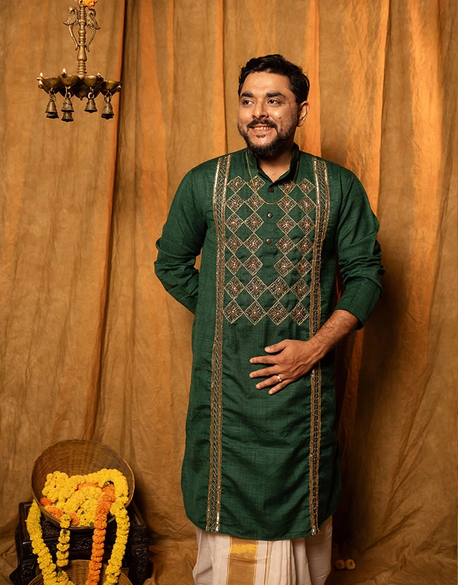 Model is wearing M size Udbhabon Punjabi & Bodhon Dhuti.